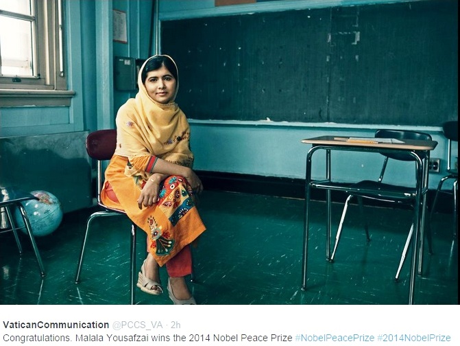 A Santa Sé enviou os "parabéns" aos premiados durante a abertura de uma conferência de imprensa sobre a I Guerra Mundial, pouco após o anúncio dos nomes, e, através da rede social Twitter, saudou em particular a ativista paquistanesa.