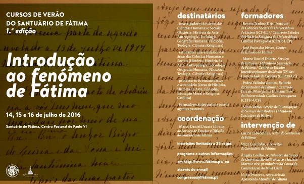 Fátima, Santarém, 14 jul 2016 (Ecclesia) – O Santuário de Fátima promove a primeira edição do Curso intensivo de Verão para investigadores e jovens universitários, entre hoje e sábado, onde “mais de meia centena” de participantes vai aprofundar “o conhecimento sobre o fenómeno de Fátima”.