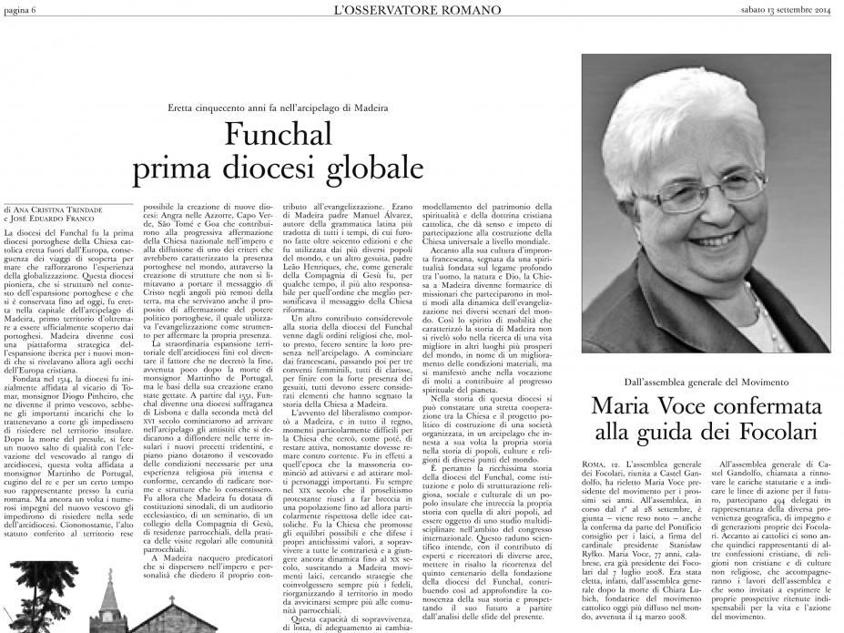 Cidade do Vaticano, 12 set 2014 (Ecclesia) - O jornal do Vaticano publicou hoje um artigo sobre a Diocese do Funchal, nos 500 anos da sua fundação, em que se destaca o seu caráter “global” e se assinala o papel que desempenhou no contexto da expansão portuguesa.