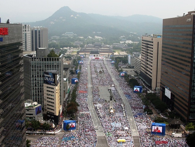 Francisco depositou uma coroa de flores e rezou em silêncio, antes de seguir em carro aberto para a praça de Gwanghwamun, ligada ao julgamento e execução de milhares de católicos que recusaram o confucionismo.