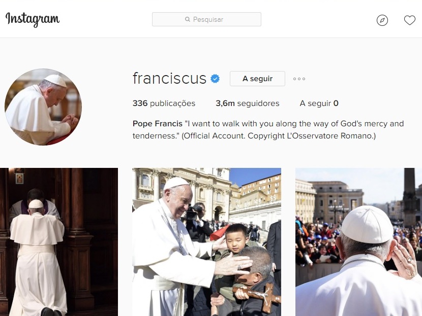 A conta oficial tem mais de 330 postagens, quase uma por dia, num perfil que é aberto pela frase “Quero caminhar contigo pela estrada da misericórdia e ternura de Deus”.