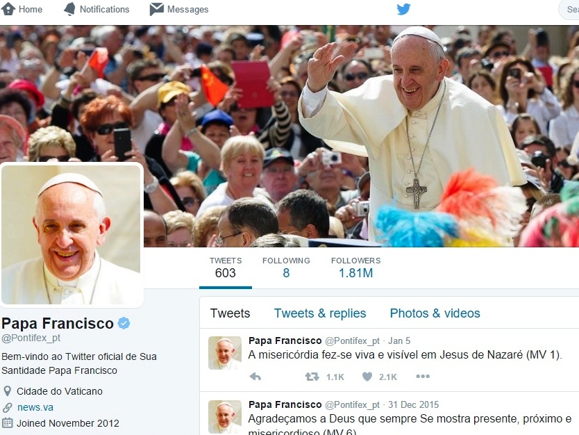 Cidade do Vaticano, 07 jan 2016 (Ecclesia) - A conta do Papa na rede social Twitter, ‘@Pontifex’,atingiu a marca de 26 milhões de seguidores, com mais de 1,8 milhões em língua portuguesa, revelou hoje a Rádio Vaticano.