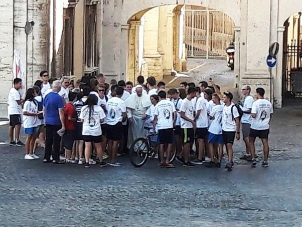 Cidade do Vaticano, 06 set 2016 (Ecclesia) - O Papa encontrou-se hoje de surpresa com um grupo de jovens peregrinos em bicicleta, vindos de Milão, na praça que fica em frente à Casa de Santa Marta, no Vaticano, onde reside.
